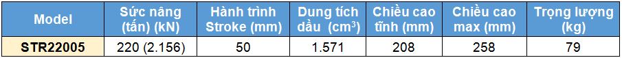 - Kích thủy lực 1 chiều vòng hãm Larzep model STR22005 có sức nâng 220 tấn, hành trình pistong 50 mm, hoạt động dưới áp suất < 700 bar. Đầu ra được nối với đầu coupler tiêu chuẩn bắt ren 3/8"-NPT.