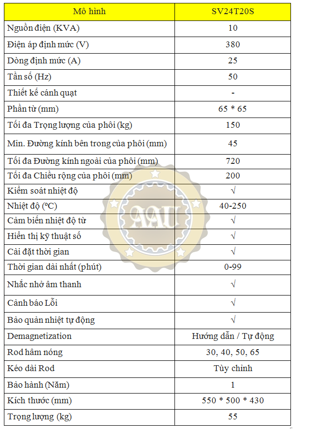 - Máy gia nhiệt SV24T20S có đường kính trong nhỏ nhất: 45mm, đường kính ngoài lớn nhất: 720mm, độ dày chi tiết max: 200mm, trọng lượng vòng bi max: 150kg.