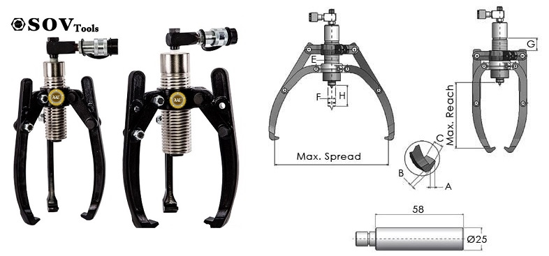 Cảo thủy lực SV16T12 là dòng cảo thủy lực rời bơm ( kết nối với bơm tay, bơm khí nén hoặc bơm điện thủy lực thông qua ống dây ) có sức kéo/đẩy 12 tấn, hành trình xi lanh 300 mm, độ mở chân cảo 515 mm, trọng lượng 11.5 kg.