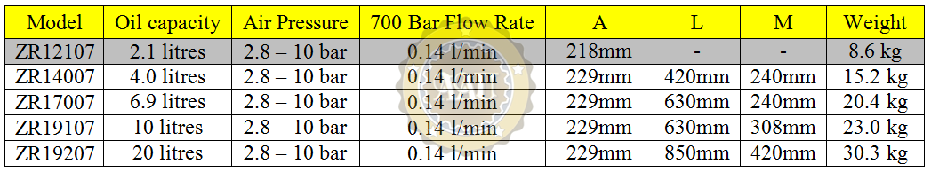 - Bơm khí nén thủy lực của Larzep ZR12107 có dung tích dầu 2.1 lít, lưu lượng dầu tại áp 700 bar : 0.14 l/min.
