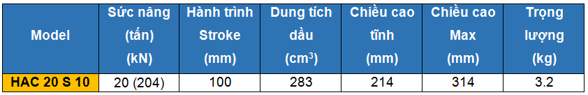 - Kích thủy lực 1 chiều bằng nhôm Holmatro model HAC 20 S 10 có sức nâng 20 tấn, hành trình pistong 100 mm, hoạt động dưới áp suất < 720 bar. Đầu coupler kết nối với dây thủy lực có ren chế tạo theo tiêu chuẩn: 3/8”- NPT.