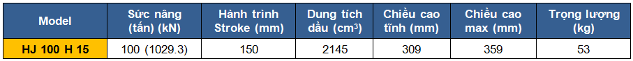 - Kích thủy lực 2 chiều Holmatro HJ 100 H 15 có sức nâng/hạ 100 tấn , hành trình pistong 150 mm, hoạt động dưới áp suất < 700 bar.