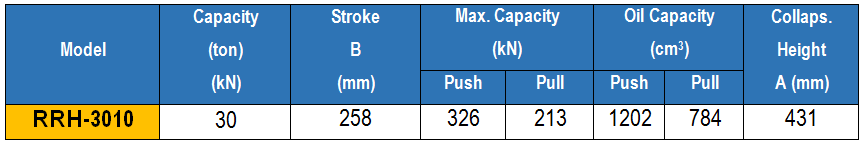 - Kích thủy lực 2 chiều rỗng tâm Duplex RRH-3010 có sức nâng 30 tấn, hành trình pistong 258 mm, đường kính rỗng tâm 33.3 mm. Hoạt động ở áp suất < 700 bar.