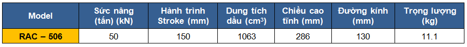 - Kích thủy lực 1 chiều bằng nhôm Duplex RAC-506 có sức nâng: 50 tấn, hành trình xi lanh max 150 mm. Hoạt động ở áp suất < 700 bar.