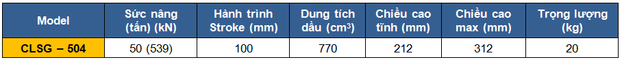- Kích thủy lực 1 chiều CLSG-504 có sức nâng 50 tấn, hành trình pistong 100 mm. Hoạt động ở áp suất < 700 bar(10.000 psi). Được kết nối với đầu ra coupler 3/8" - NPT.