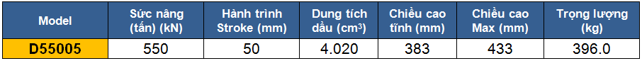 - Kích thủy lực 2 chiều Larzep model D55005 có sức nâng 550 tấn, hành trình pistong 50 mm, hoạt động dưới áp suất < 700 bar. Đầu coupler kết nối với ống dây thủy lực theo tiêu chuẩn bắt ren 3/8"-NPT.