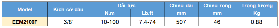 - Cờ lê lực EEM2100F có dải lực siết từ 10-100 N.m. Việc điều chỉnh lực thông qua điều chỉnh lực trên màn hình điện tử được gắn sẵn trên cờ lê, khẩu đầu ra theo tiêu chuẩn 3/8".